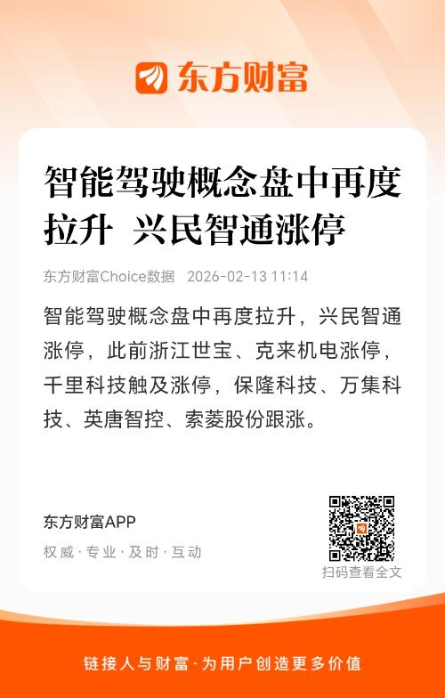 智能驾驶概念盘中再度拉升,兴民智通涨停,此前浙江世宝克来机电涨停,千里科技触及涨停,保隆科技万集科技英唐智控索菱股份跟涨。消息面上,工信部装备工业一司组织全国汽车标准化技术委员会开展了《智能网联汽车自动驾驶系统安全要求》等五项强制性国家标准的制修订,已形成征求意见稿,现公开征求社会各界意见。