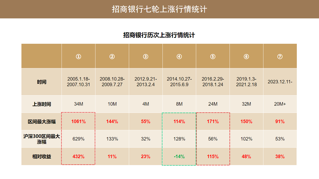 这个是我们从细分的牛熊周期去看招商银行过去的 20 年 7 轮主要上涨行情的上涨时间跟上涨幅度的情况。