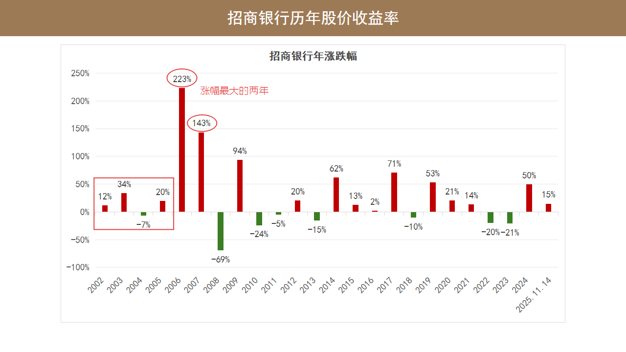 2022 年招商银行的跌幅是 20%;2023 年的跌幅是 22%,这两年连续的下跌是招商银行遇到的比较大的挑战。924 行情以后,2024 年招商银行的年度涨幅是 50%,截止 2025 年 11 月中旬,招商银行的年度涨幅是 15%。