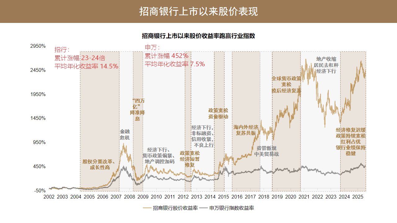 招商银行是 2002 年的 4 月份在 A 股上市,如果从上市至今,截止到 2025 年年底,招商银行的累计涨幅是 23-24 倍,平均年化收益率是 14.5%。同期我们可以看,申万的银行指数的累计收益是 452%,年化收益率是 7.5%。同期对比来看,招商银行上市到 2025 年年底,在股价上的累计涨幅是远远超过申万银行指数的累计表现的。