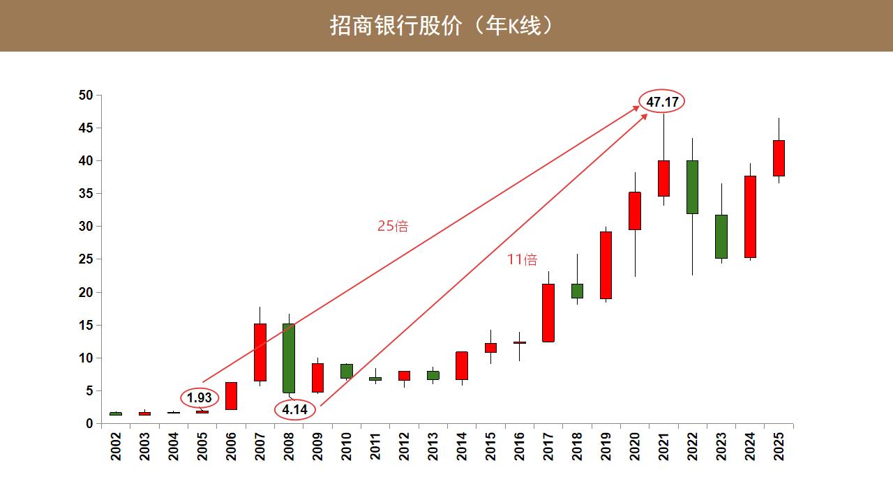 如果从招商银行过去二十几年的年 K 线来看,其实招商银行上市过来 24 根年 K 线,趋势性还是非常强的。招商银行的股价从 2005 年低点是 1.93 元,到 2021 年的高点是 47.17 元,这中间的涨幅接近了 25 倍。如果说从 2008 年低点 4.14 元的价格,到 2021 年最高点 47.17 元,这中间最大的涨幅 11 倍多。