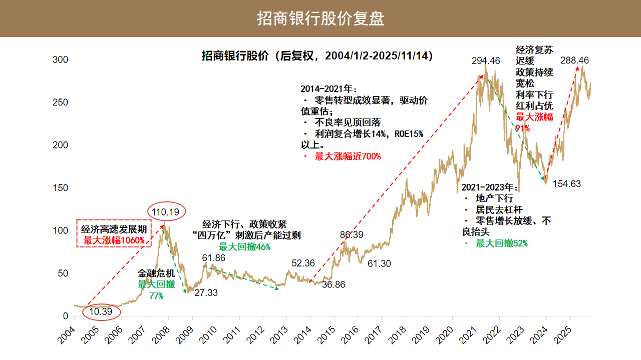 所以整个 20 年过来,招商银行的股价有两次比较大幅的上涨,一次是 2005 年到 2007 年,这波行情涨了 10 倍,还有一次是 2014 年到 2021 年,这波行情涨了 7 倍,剩下的就是过去两年,招商银行从 2024 年反弹过来的,也涨了 90%。同时期间遇到三次比较大的挑战,一次是 2008 年的金融危机,最大跌幅接近 80% 的水平,还有一次比较难的挑战就是 2021 年到 2023 年这三年的房地产去杠杆周期里面,招商银行的股价跌幅超过 50%,中间还有一次跌幅接近 50% 的是 2010 年到 2013 年,这波经济下行周期里面,招商银行的股价跌幅跌去了 46%。