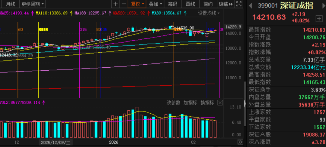 明天深成指将再次遇到拐点时间,上周五遇到拐点时间形成新低底背离,促成了周一的大涨,那么明天的拐点时间会如何呢? 从分钟级别看,当下指数有钝化压力,估计明天又是一个小涨小跌的K线,等这个消化钝化后,反而后天有可能再出现一次大涨,总之,在我看来节前还有机会大涨一次。 当然,不管是否大涨,如果持股过节的前提是我的多空比数据最好在1之上,到时候中午午盘号会发截止中午的时候多空比的数据,因为如果数据太低持股过节实在太冒险,但数据如果比较高的话,不至于遭遇太大风险。(橙先生) (来源:橙先生的视界的财富号 2026-02-10 22:54) [点击查看原文]