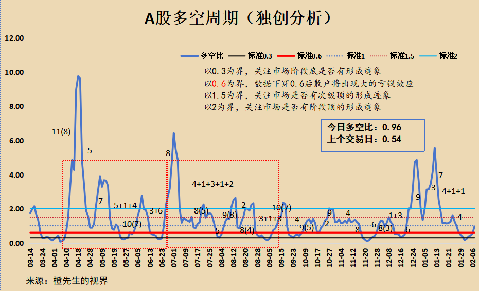大家好,我是橙先生。 今天多空比来到0.96,数据重新实质站上0.6,以后要记住0.6这个分水岭带给市场的强弱之别。只要你按照我的数据走了,你就自然可以相对轻松的面对市场的涨跌问题。