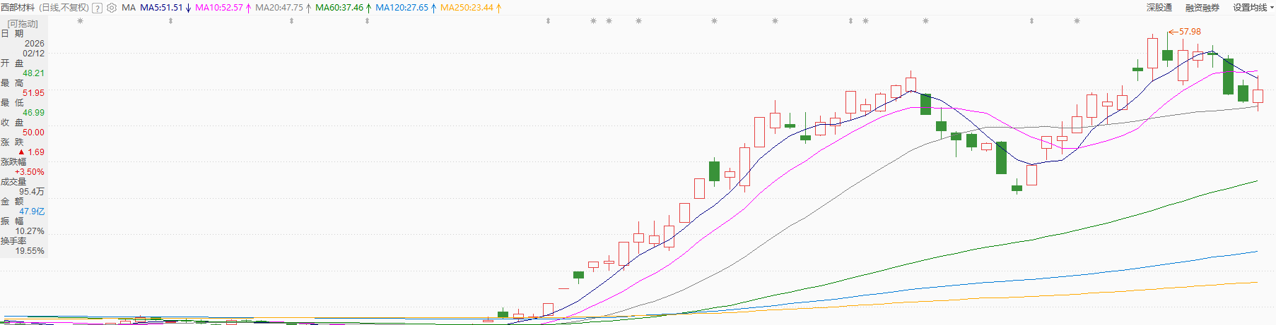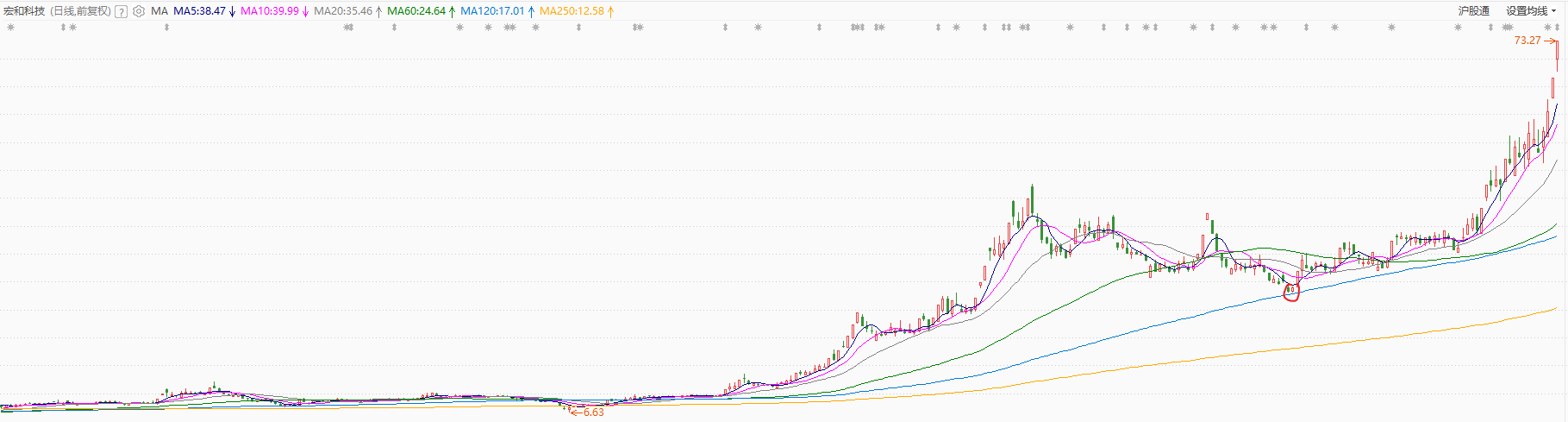 对于飞沃这批商业航天的龙头股,小哥还是看好他们未来能进一步上涨的,这一波上涨,他从50块涨到250块,翻了5倍了,未来如果涨到400-500,那翻得就更多了,只是这种10倍股的诞生,中间一旦被打断,是很容易在日线上回踩120日线,月线上跌破5月线的。对此我们可以看这两天还在连板的另一只股票宏和科技。