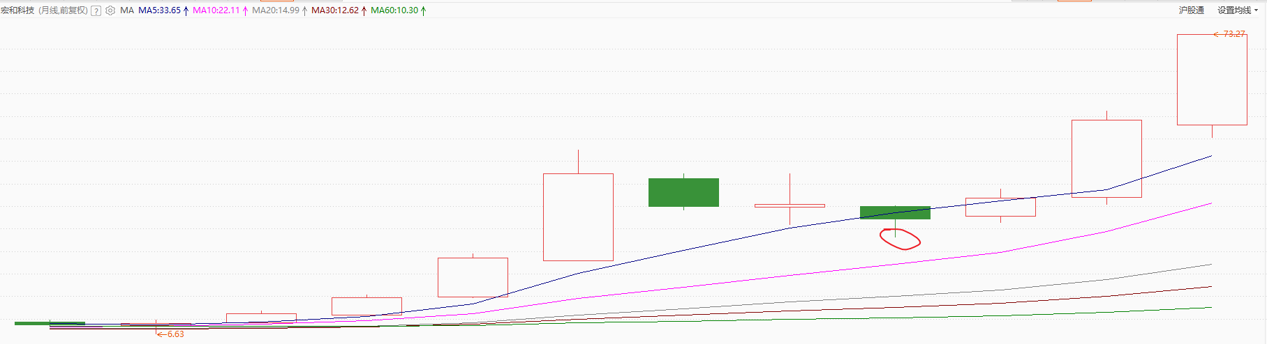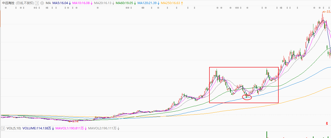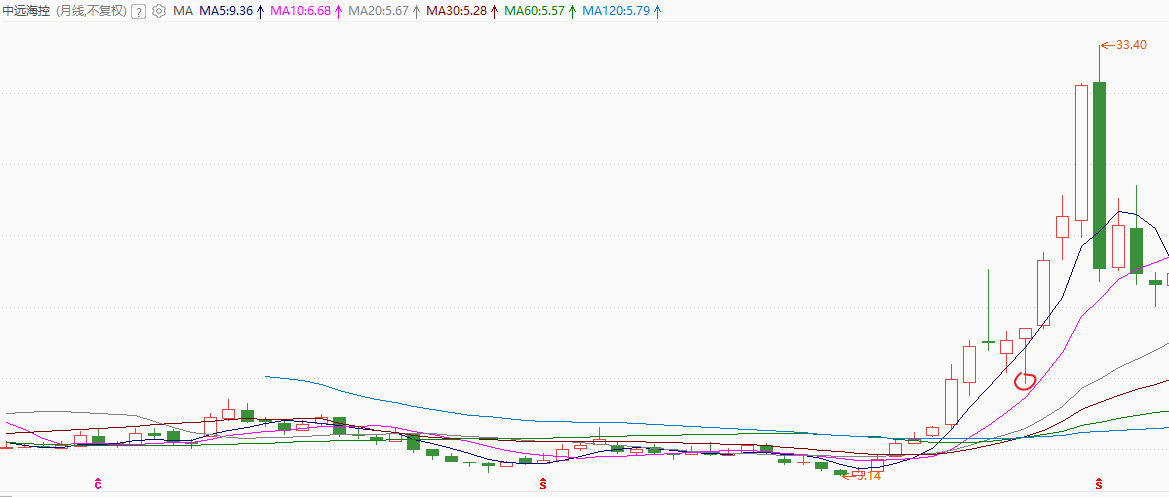再看另一个2020-2021年的大牛股中远海控从3元涨到33元的过程,月线图同样回踩到5-10月线中间的位置
