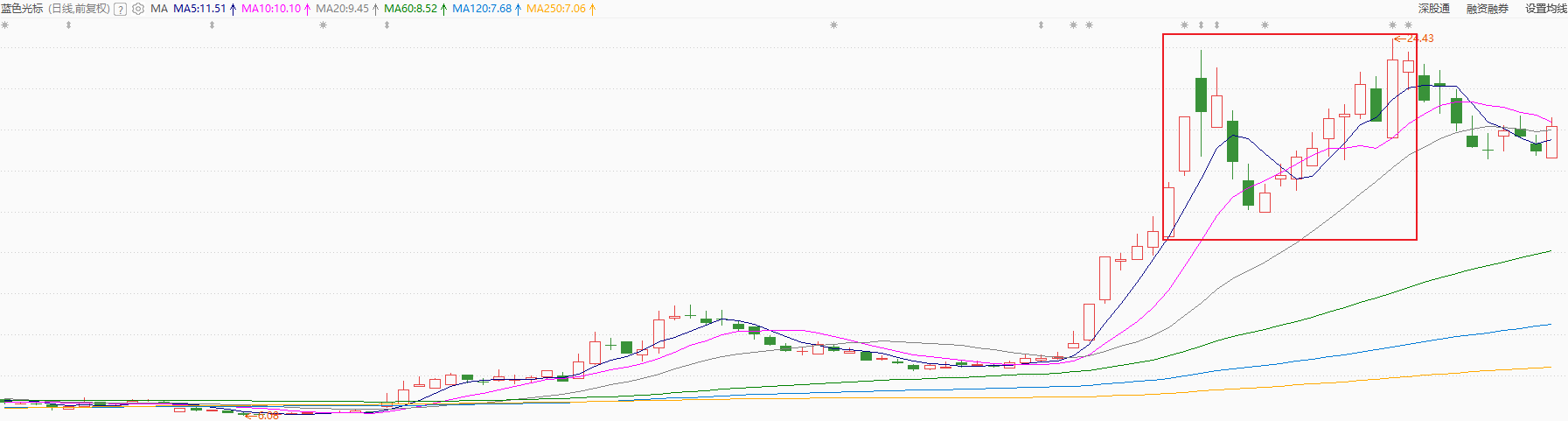 再看日线图,同样是在3元涨到15元,翻了5倍之后,出现了一个长达3个月的调整波段,最终的低价也是出现在120日线。