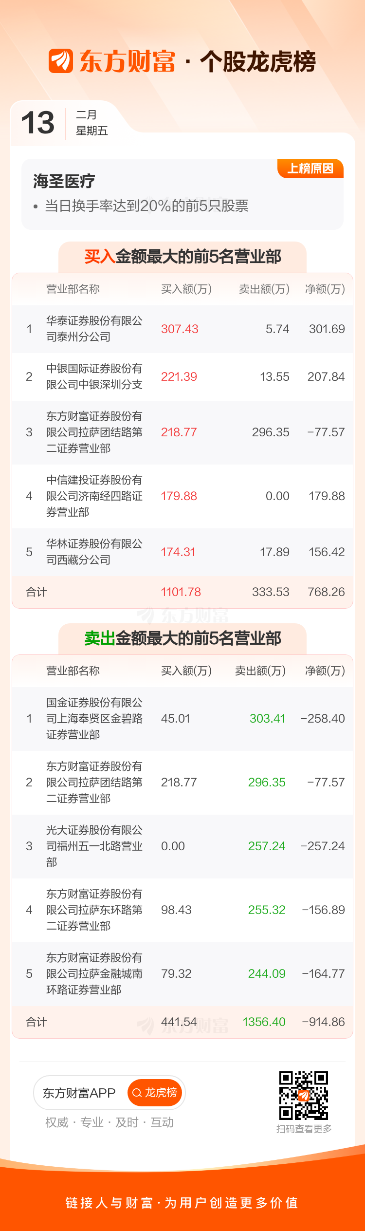 交易所2026年2月13日公布的交易公开信息显示,海圣医疗因成为当日换手率达到20%的前5只股票上榜。海圣医疗当日收报29.56元,涨跌幅-14.29%,偏离值24.73%,换手率24.73%,成交额1.79亿。
