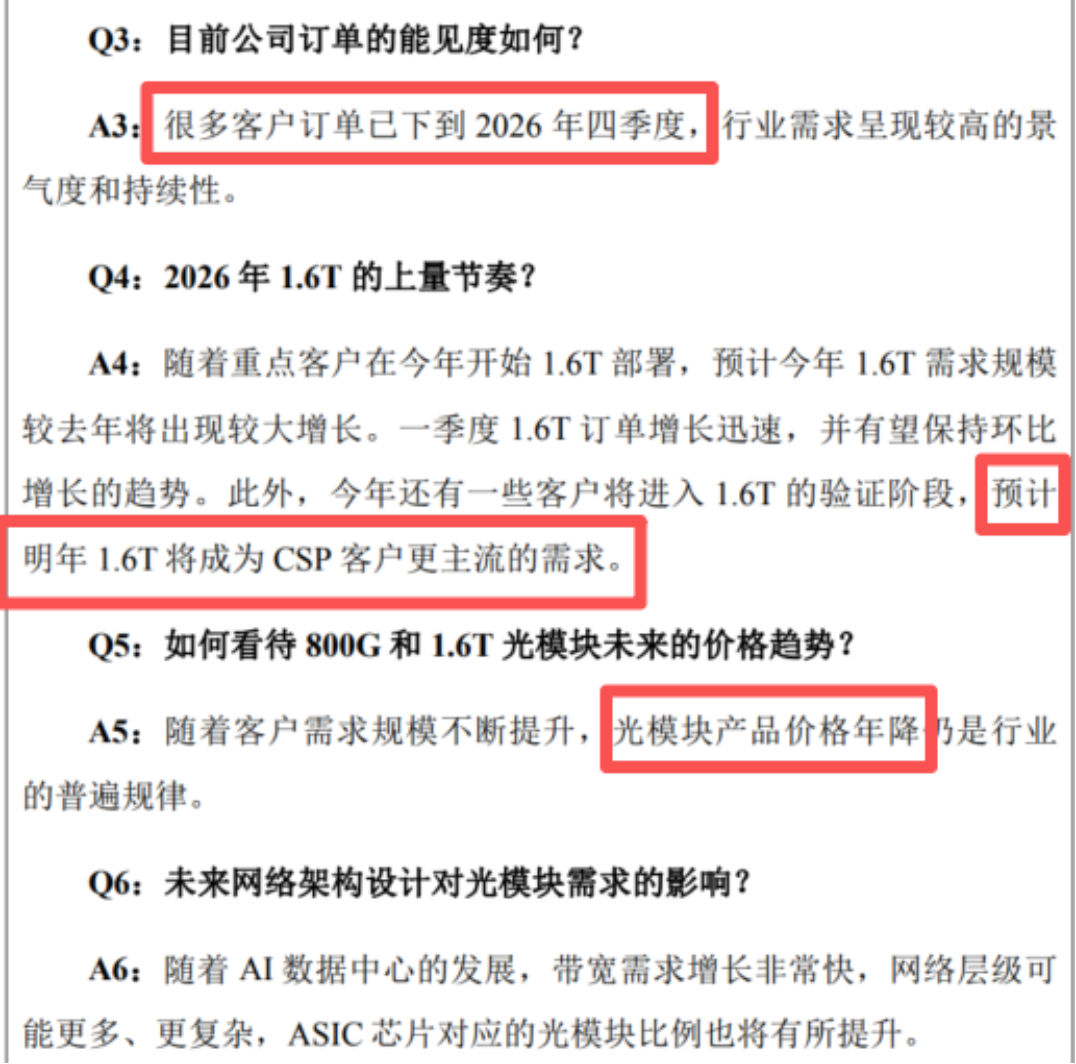 在算力端,光模块龙头中际旭创依然是门庭若市,两个月吸引了137家机构的目光。机构的问题话题围绕1.6T光模块的订单情况、硅光渗透进度以及新场景布局展开。这表明,市场对于算力基础设施的焦虑已转变为对技术迭代速度的考察。