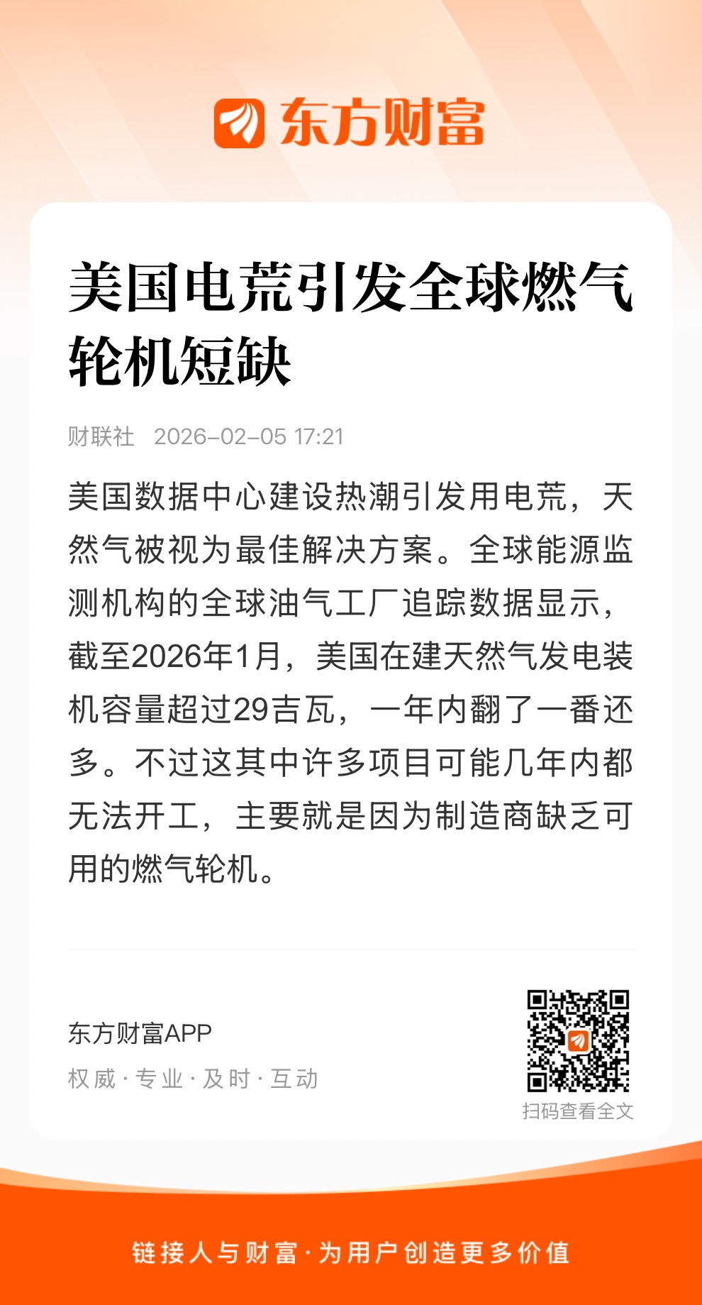 美国数据中心建设热潮引发用电荒,天然气被视为最佳解决方案。全球能源监测机构的全球油气工厂追踪数据显示,截至2026年1月,美国在建天然气发电装机容量超过29吉瓦,一年内翻了一番还多。不过这其中许多项目可能几年内都无法开工,主要就是因为制造商缺乏可用的燃气轮机。GE Vernova首席执行官指出,2025年该公司的燃气轮机合同量增长了约80%,然而大部分在过去两年内签订的高利润订单需要到2027年以后才能开始交付。