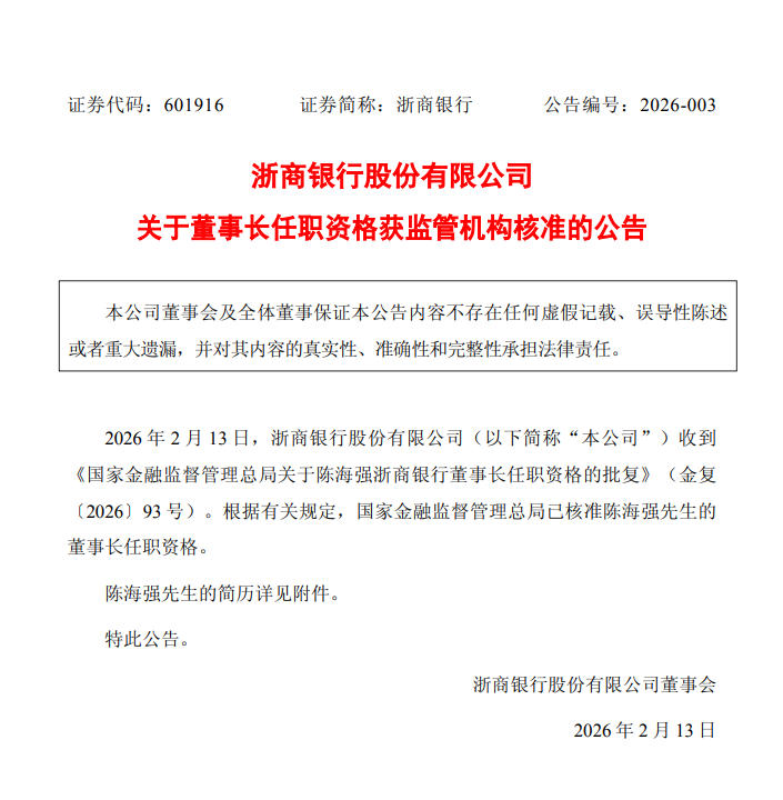 【浙商银行:陈海强的董事长任职资格获监管机构核准】浙商银行2月13日公告,公司收