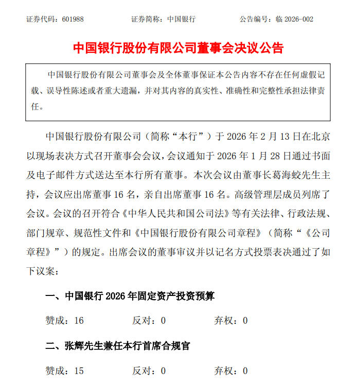 【中国银行:聘任副董事长、行长张辉兼任首席合规官】2月13日,中国银行发布董事会