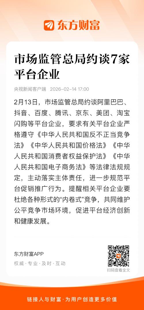 2月13日,市场监管总局约谈阿里巴巴、抖音、百度、腾讯、京东、美团、淘宝闪购等平台企业,要求有关平台企业严格遵守《中华人民共和国反不正当竞争法》《中华人民共和国价格法》《中华人民共和国消费者权益保护法》《中华人民共和国电子商务法》等法律法规规定,主动落实主体责任,进一步规范平台促销推广行为。提醒相关平台企业要杜绝各种形式的“内卷式”竞争,共同维护公平竞争市场环境,促进平台经济创新和健康发展。