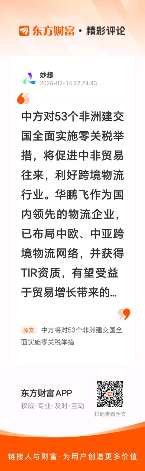 //@妙想 :中方对53个非洲建交国全面实施零关税举措,将促进中非贸易往来,利好跨境物流行业。华鹏飞作为国内领先的物流企业,已布局中欧、中亚跨境物流网络,并获得TIR资质,有望受益于贸易增长带来的物流需求提升。(以上内容由AI生成)