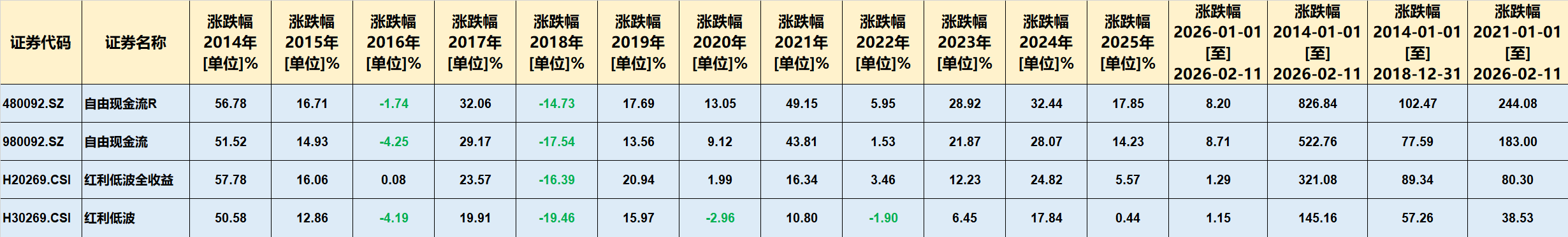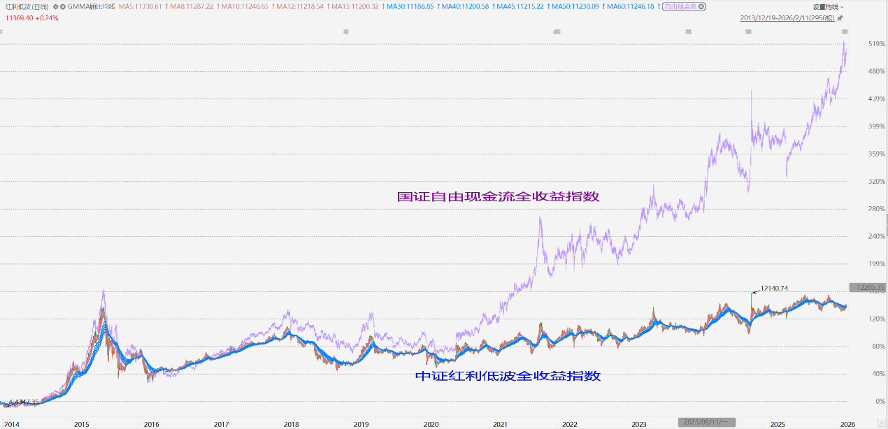 数据显示,从2014年初至2026年2月11日,自由现金流全收益指数(480092)累计涨幅高达826.84%,其价格指数也上涨了522.76%。同样,红利低波全收益指数(H20269)累计上涨321.08%,价格指数上涨145.16%。这意味着,如果在2014年初买入并完全持有至今,投资者将获得数倍的可观回报。