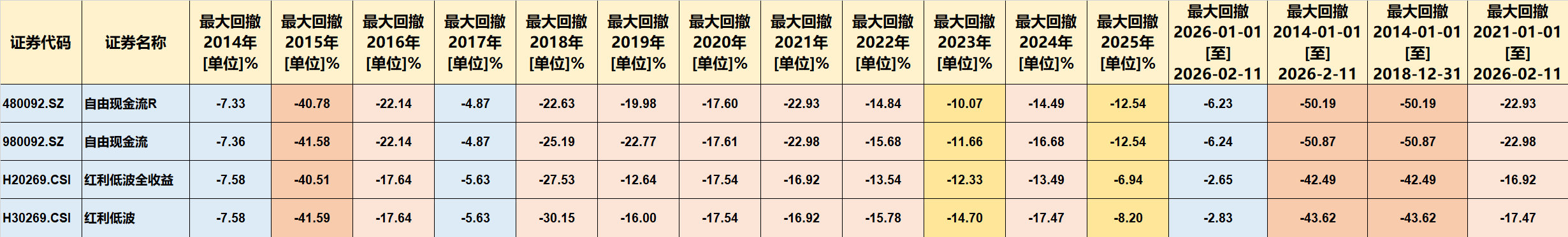 2015年期间,自由现金流指数年度最大回撤超过41%,红利低波指数也超过40%。2016年熔断后,两个指数年度最大回撤仍在17%-22%之间。2018年贸易摩擦背景下,红利低波指数年度最大回撤超过30%,自由现金流指数超过25%。整个2014年至2018年期间,自由现金流指数的最大回撤达到50.87%,红利低波指数达到43.62%。