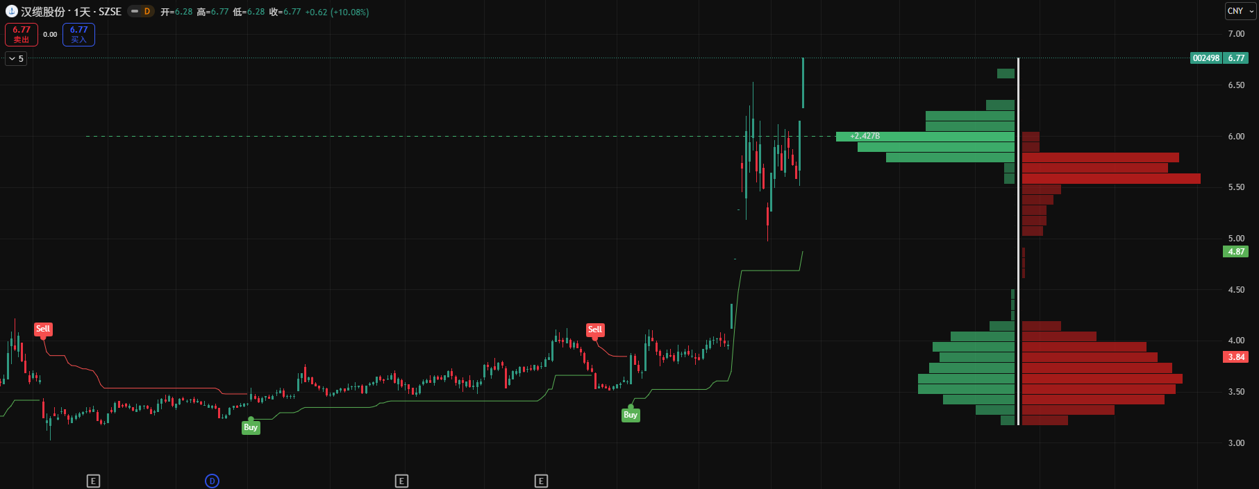 信号解析: 日线图中,此前在 4.00 元 附近出现了清晰的绿色 “Buy” 信号,成功捕捉到了本轮长波段行情的底部。