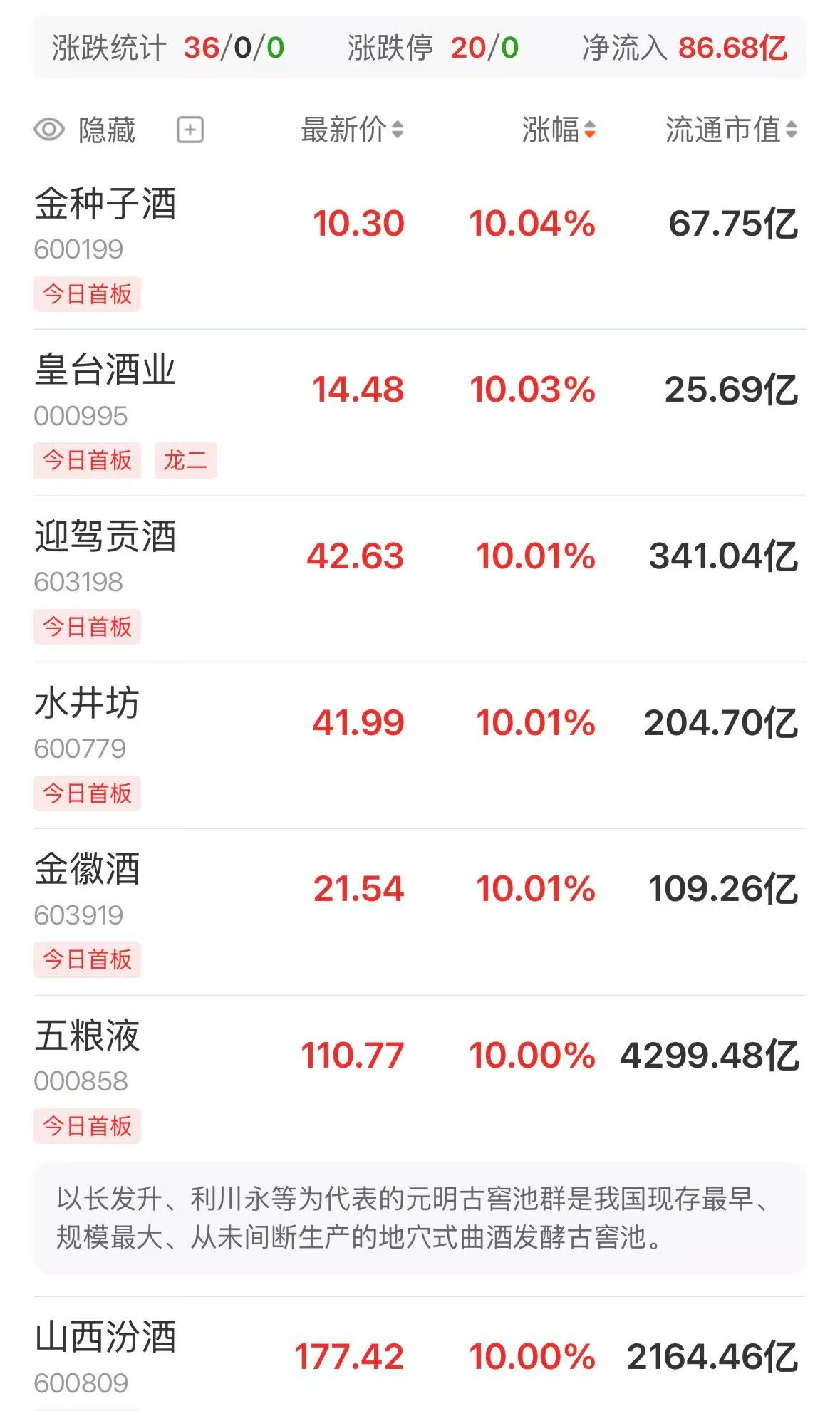 当然,不是只有茅台自己涨,整个板块全部起飞,泸州老窖、水井坊、舍得酒业、皇台酒业、酒鬼酒等直接涨停,这盛况很久没看到了。