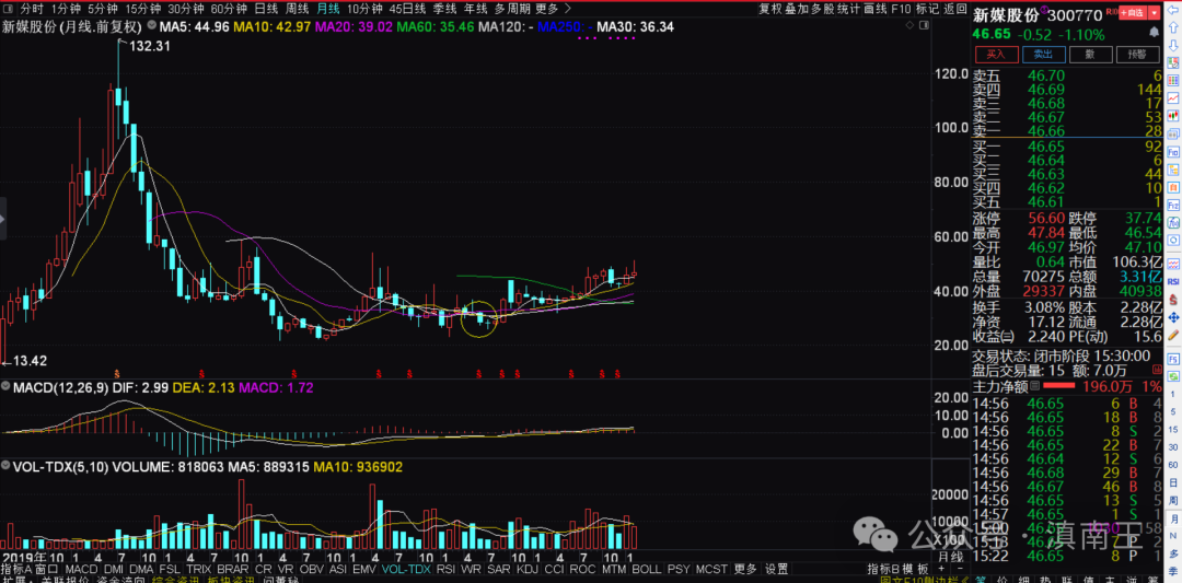 上图月线走势图,非常清楚,上市后,炒作后开始调整,调整也非常充分,在月线筑底的时候埋伏,黄圈就是埋伏的位置!所以,新媒的例子再次证明,买的便宜才是硬道理!