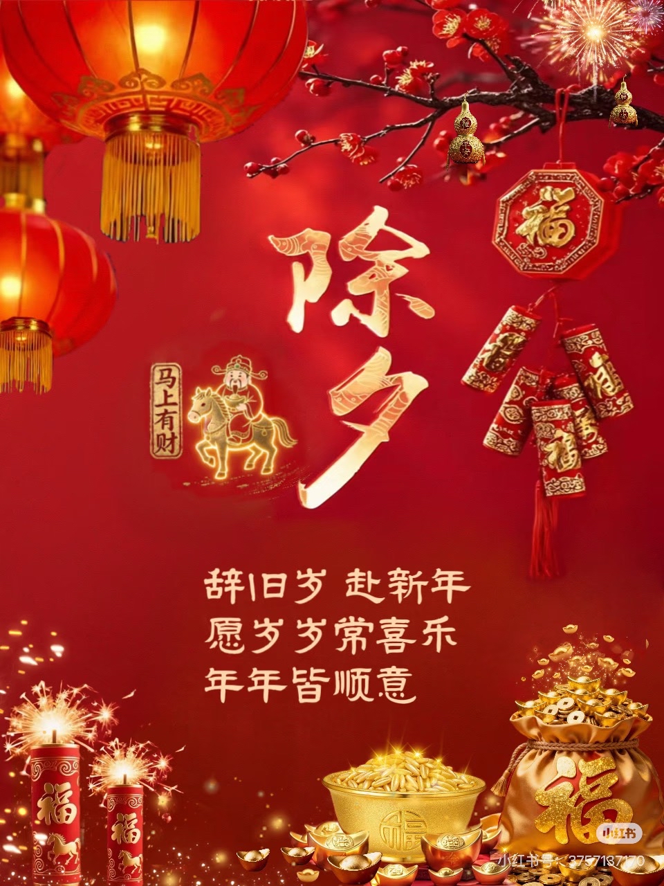 今天就是除夕了,除夕辞旧岁,金马迎新春,烟火向星辰,财运满家门,祝你除夕快乐,马