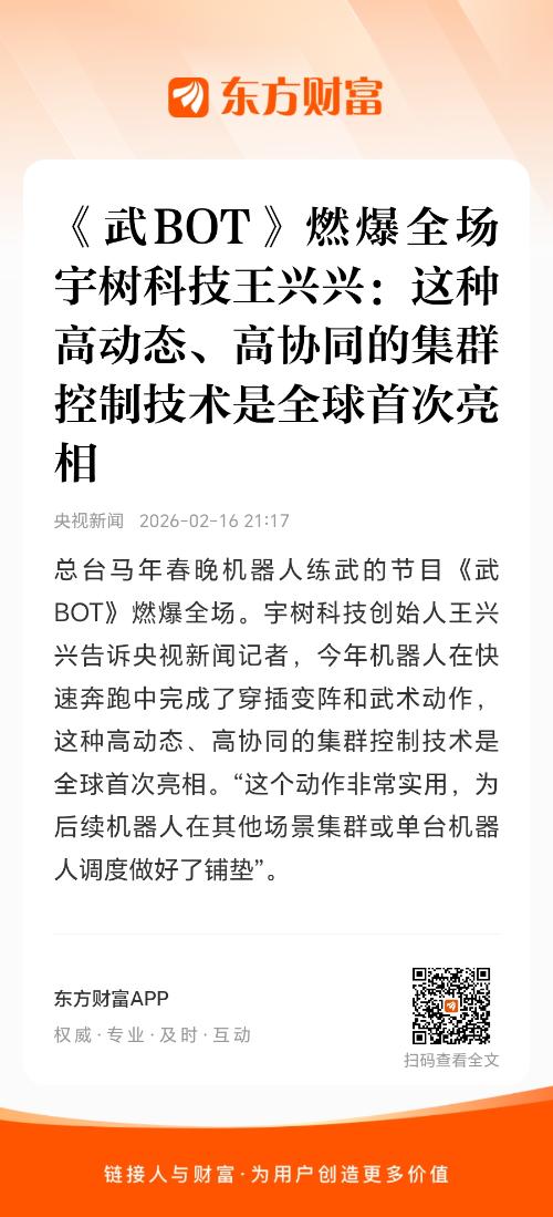 总台马年春晚机器人练武的节目《武BOT》燃爆全场。宇树科技创始人王兴兴告诉央视新闻记者,今年机器人在快速奔跑中完成了穿插变阵和武术动作,这种高动态、高协同的集群控制技术是全球首次亮相。“这个动作非常实用,为后续机器人在其他场景集群或单台机器人调度做好了铺垫”。