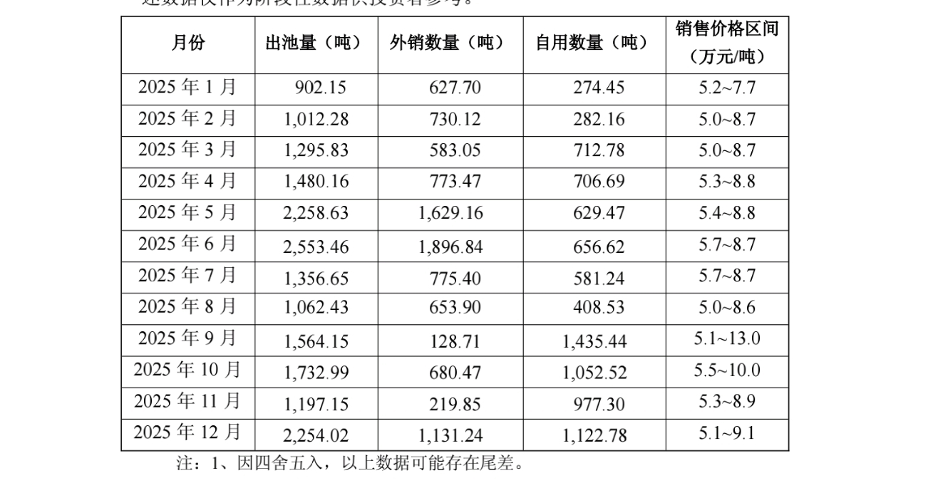 月份 出池量(吨) 外销数量(吨) 自用数量(吨) 销售价格区间