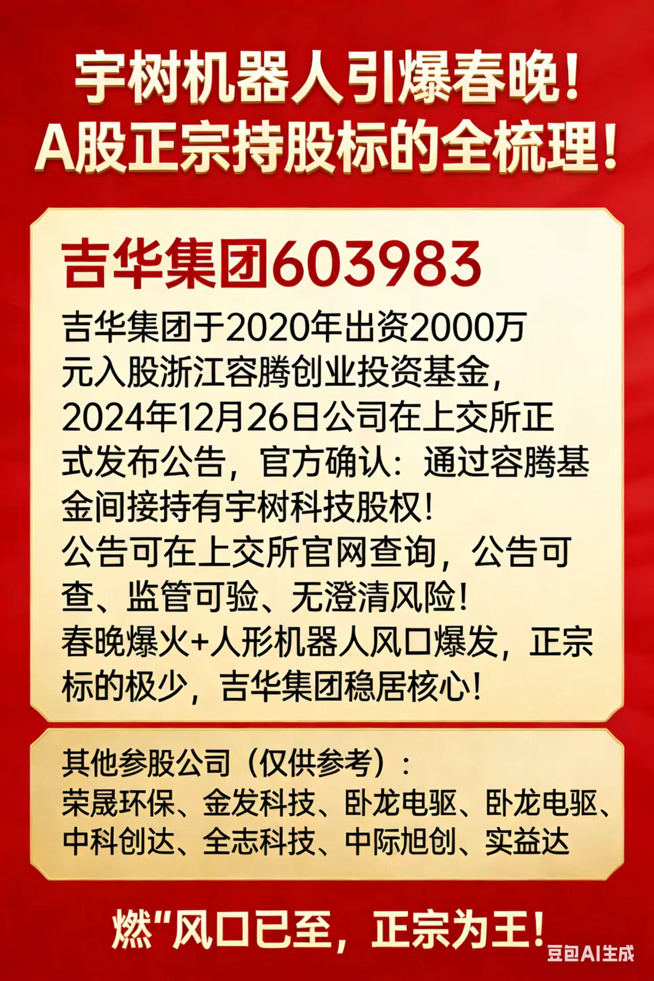 央视春晚宇树机器人震撼登场,全民刷屏,人形机器人超级风口彻底引爆!全市场正宗持股标的稀缺至极,吉华集团凭借公告实锤、路径清晰,稳居第一正宗标的!