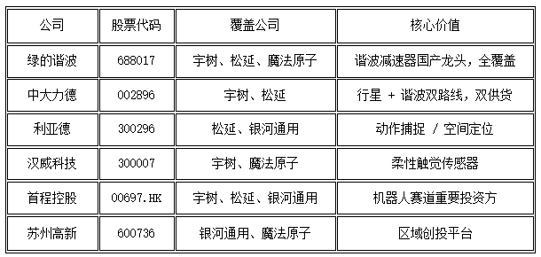 按业务合作 / 供应链、资本参股 / 间接持股分类,与宇树科技、松延动力、银河通用、魔法原子四家机器人公司的关联概念股梳理情况如下(信息截至 2026 年 2 月 17 日)。