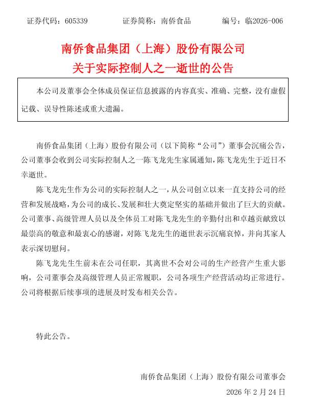 【南侨食品:公司实际控制人之一陈飞龙逝世】