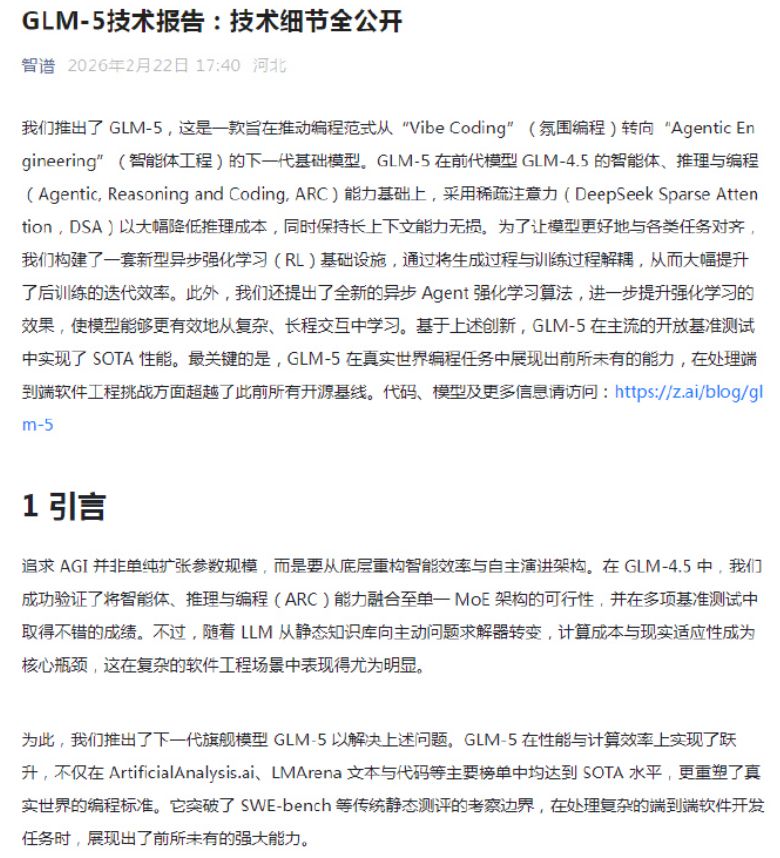 2月22日,智谱发布技术报告,全面解读GLM-5的技术细节。
