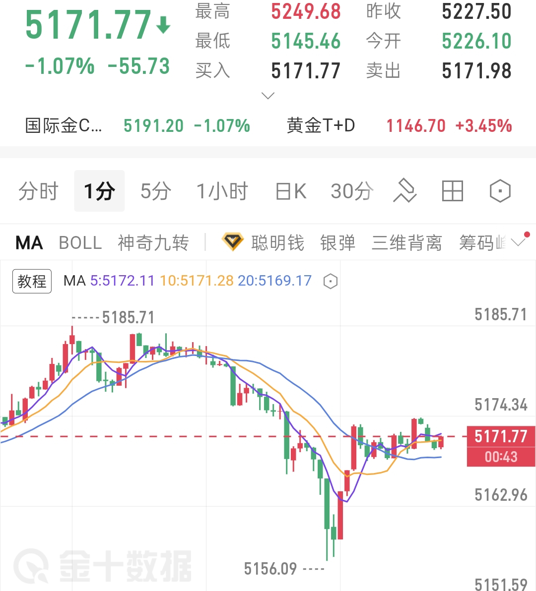 今日早盘黄金先扬后抑,冲高至5249附近遇阻回落,最低下探5145,随后小幅反弹,目前在5168附近区间整理。短线上呈现冲高承压、急跌寻底、反弹力度偏弱的特征,多空博弈明显加剧。