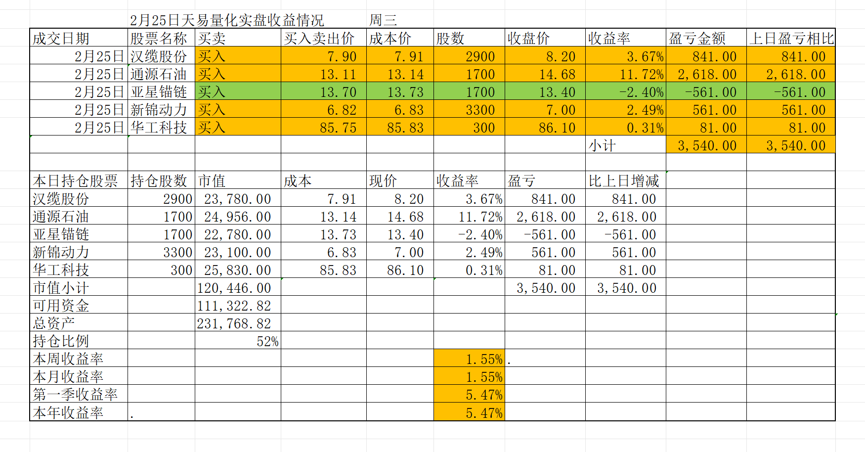 【2月25日天易量化复盘】汉缆股份涨停、通源石油大涨14%节后事多,也没多看盘。