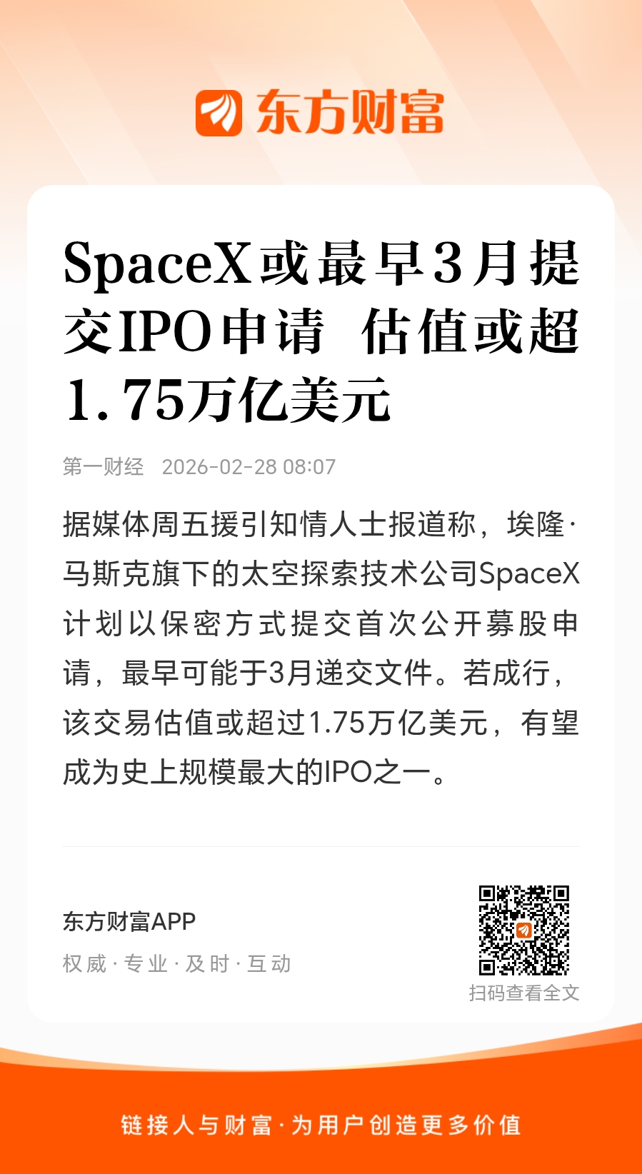 据媒体周五援引知情人士报道称,埃隆·马斯克旗下的太空探索技术公司SpaceX计划以保密方式提交首次公开募股申请,最早可能于3月递交文件。若成行,该交易估值或超过1.75万亿美元,有望成为史上规模最大的IPO之一。