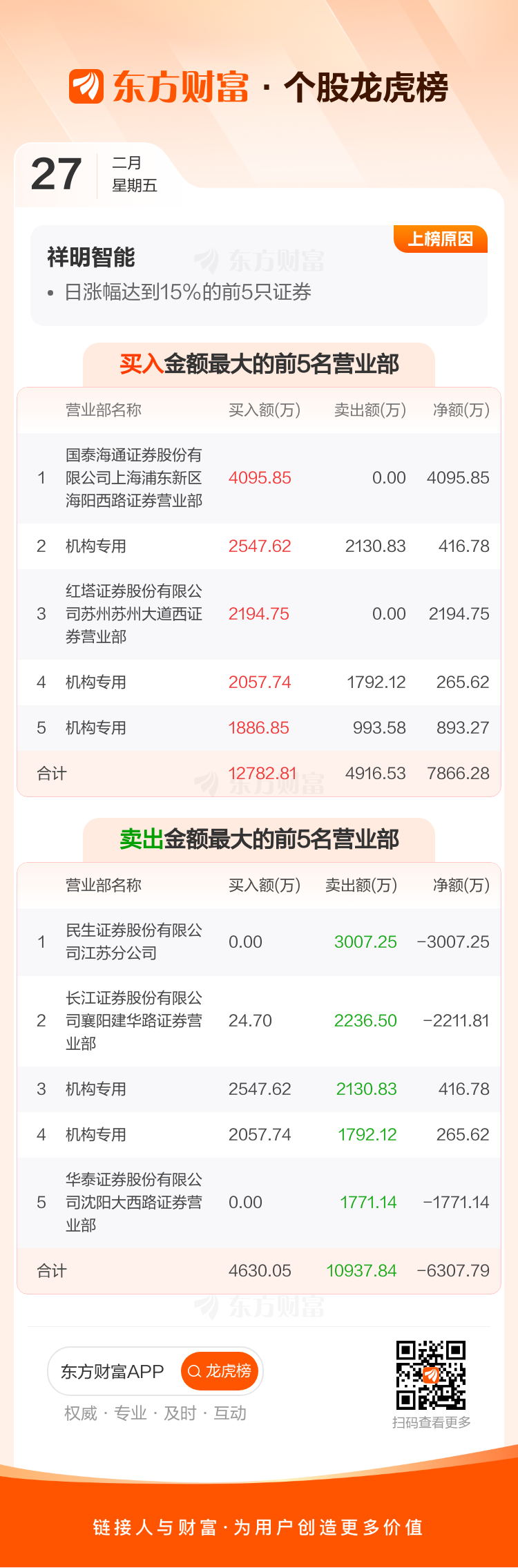 交易所2026年2月27日公布的交易公开信息显示,祥明智能因成为日涨幅达到15%的前5只证券上榜。祥明智能当日收报41.82元,涨跌幅20.00%,偏离值20.00%,换手率16.71%,成交额7.00亿。