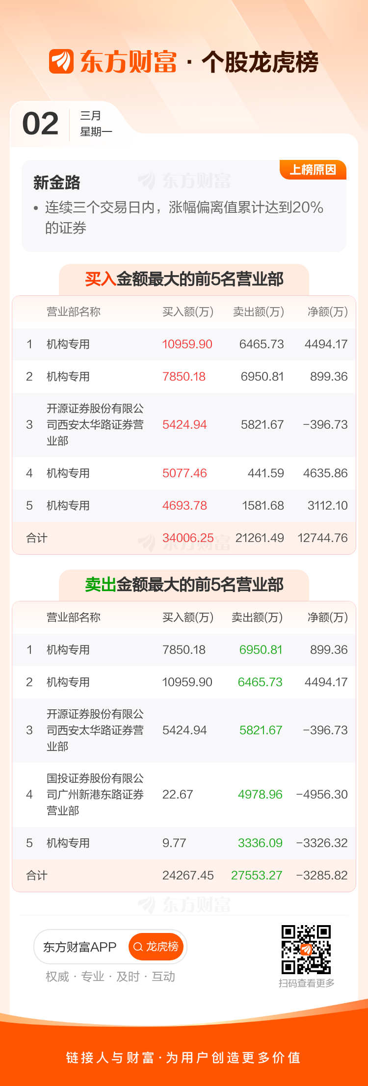 交易所2026年3月2日公布的交易公开信息显示,新金路因成为连续三个交易日内,涨幅偏离值累计达到20%的证券上榜。新金路当日收报22.45元,涨跌幅10.00%,换手率10.77%,成交额14.48亿。异常期间2月27日至3月2日,期间涨幅21.02%,累计偏离值21.40%,区间成交额27.45亿。
