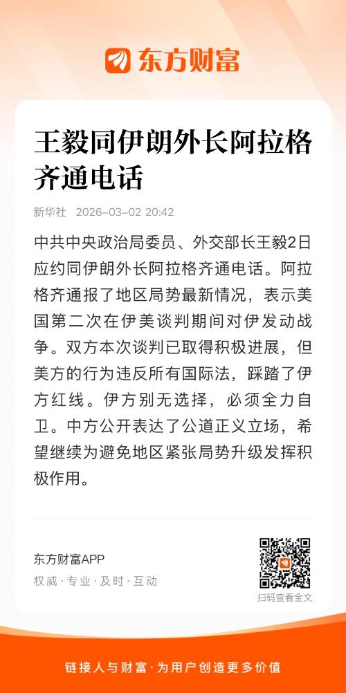 王毅表示,中方已敦促美国、以色列立即停止军事行动,避免紧张事态进一步升级,防止战事扩大蔓延至整个中东地区。相信伊方在当前严峻复杂局面下,能够保持国家社会稳定,重视邻国合理关切,维护在伊中国公民和机构安全。阿拉格齐表示伊方愿全力保障中方人员和机构的安全。