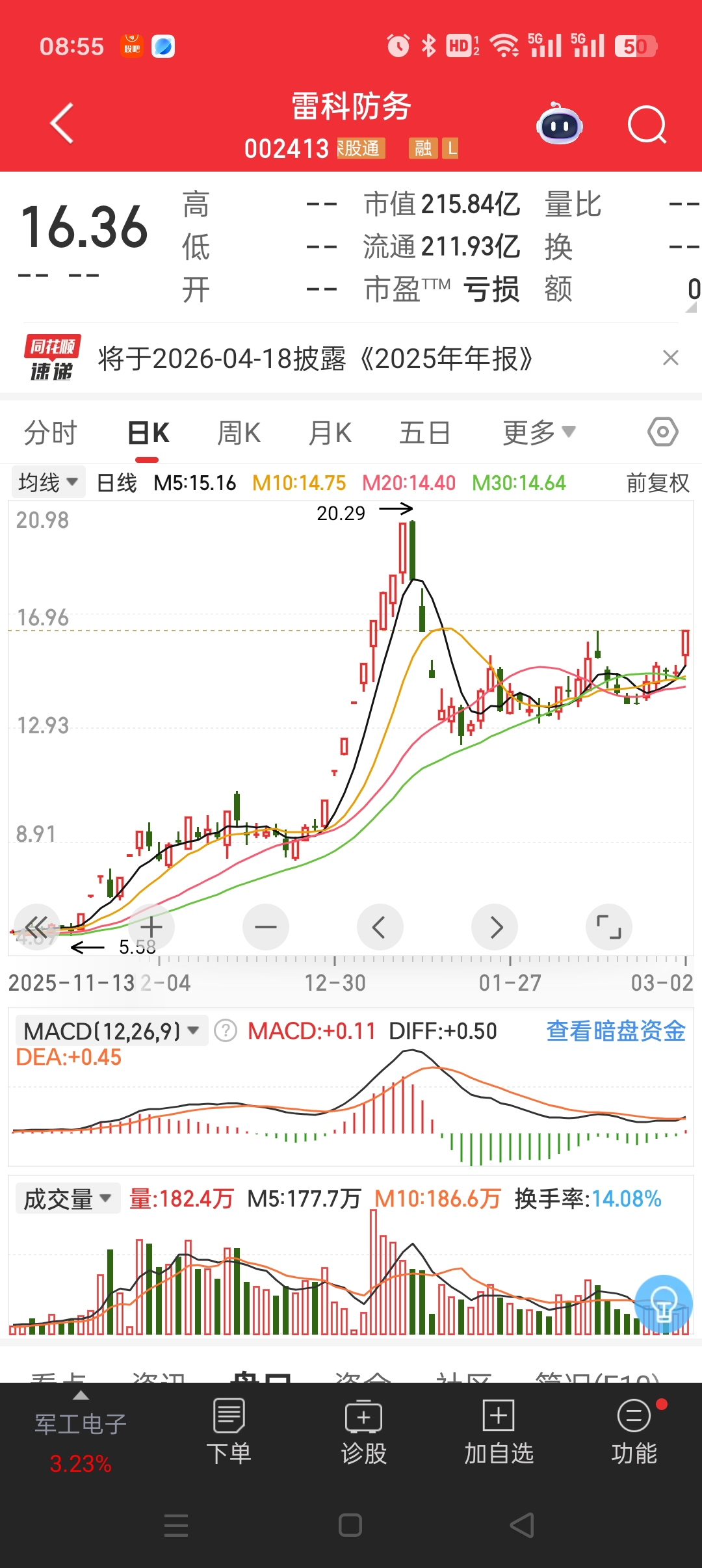 外围冲突,军工自然有机会的。雷科防务昨天强势封板,放量突破横盘平台,MACD空中加油,情绪与形态共振,是军工电子里的强势品种。个人觉得这票人气足、联动性好,适合短线博弈。技术上15.5元是强防守位,回踩都是倒车接人机会。今天可以在15.8-16元低吸,不高开乱追,耐心等待回踩,低吸至少也是水面附近,严格按纪律来,吃确定性的一段,不贪多。