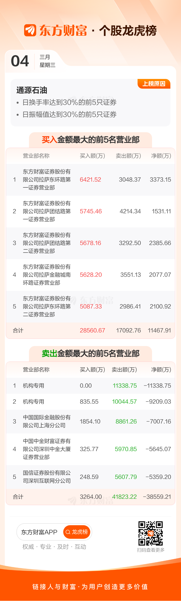 交易所2026年3月4日公布的交易公开信息显示,通源石油因成为日换手率达到30%的前5只证券、日振幅值达到30%的前5只证券上榜。通源石油当日收报24.56元,涨跌幅13.18%,偏离值53.96%,换手率53.96%,成交额68.27亿。