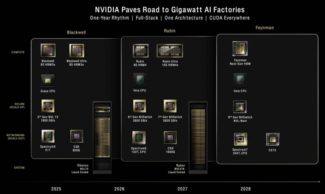 NVIDIA Rubin Ultra 作为下一代 AI 数据中心 GPU 旗舰产品,在互联带宽方面实现了跨越式升级,标志着 AI 基础设施正式进入 PB 级全互联时代。根据 NVIDIA 在 GTC 2025 大会公布的技术规格,Rubin Ultra 机柜总带宽较上一代 GB200 增长 12 倍,达到 1.5 PB/s(1555.2 TB/s)。这一突破性的带宽能力由 144 颗 GPU 共同提供,每颗 GPU 封装集成 4 个 dies,总计 576 个计算 die,对应单颗芯片双向互联带宽达到 10.8 TB/s。如此高密度的算力与带宽配置,对 Scale-up 网络架构提出了前所未有的工程挑战,或将采用双层网络拓扑以平衡极致性能、成本控制与物理可实现性。