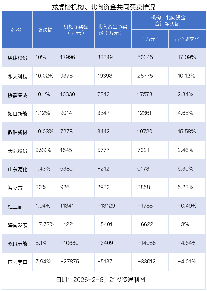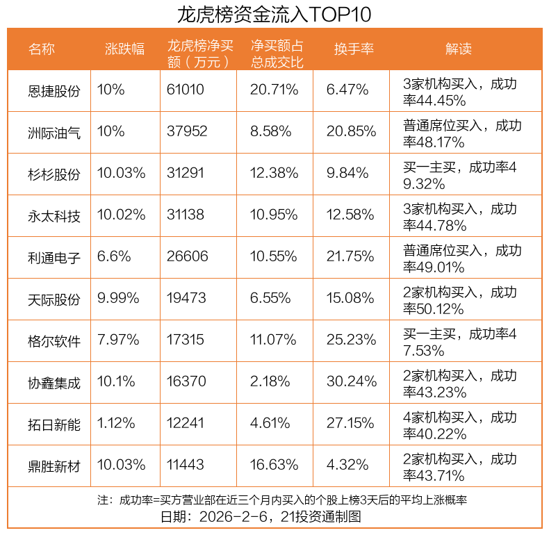 2月6日,上证指数下跌0.25%,深证成指下跌0.33%,创业板指下跌0.73%。盘后龙虎榜数据显示,共有47只个股因当日异动登上龙虎榜,资金净流入最多的是恩捷股份(002812.SZ),达6.1亿元。