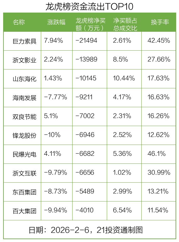 而龙虎榜中资金净流出最多的是巨力索具(002342.SZ),被净卖出为2.15亿元,占总成交金额的2.61%。巨力索具收盘上涨7.94%,换手率为42.45%。