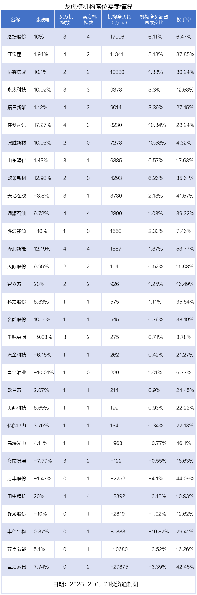 2月6日,31只个股龙虎榜出现了机构的身影,机构合计净买入4.49亿元。具体来看,机构净买入23股,净卖出8股。