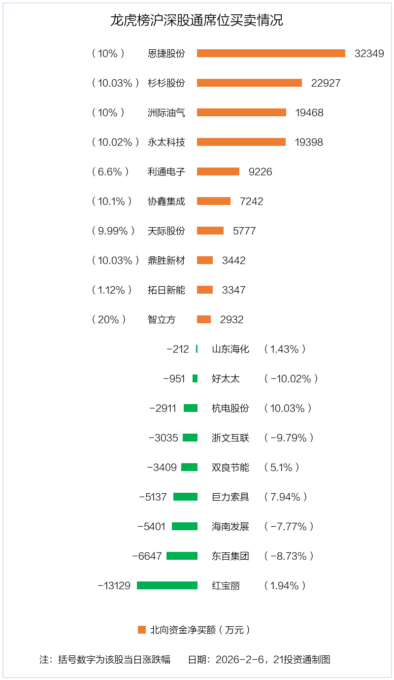 2月6日,北向资金参与龙虎榜中的个股共有19只,合计净买入8.53亿元。其中沪股通净买入4 股,净卖出5 股,合计净买入3.81亿元;深股通净买入6 股,净卖出4 股,合计净买入4.72亿元。