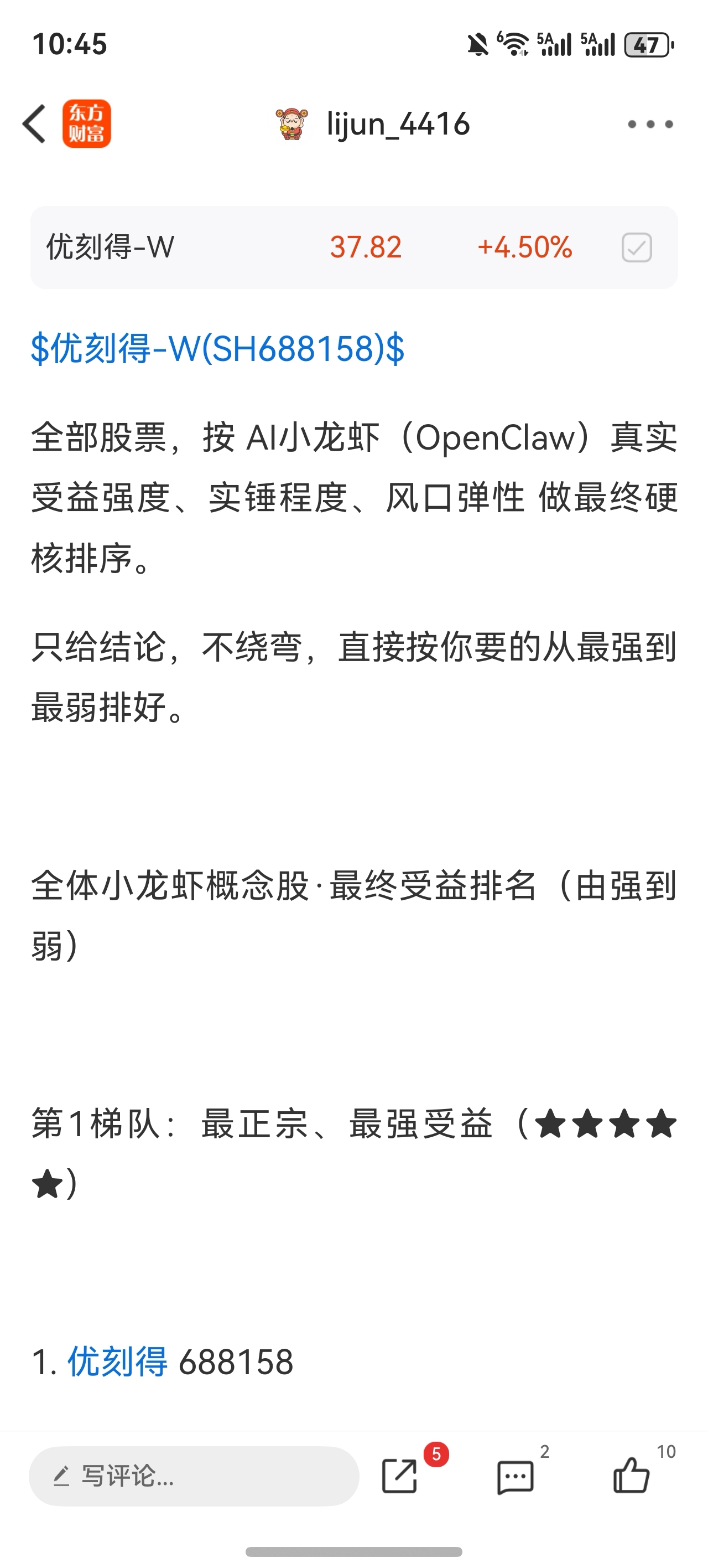 温馨提示: 1.根据《证券法》规定,禁止编造、传播虚假信息或者误导性信息,扰乱证券市场;2.用户在本社区发表的所有资料、言论等仅代表个人观点,与本网站立场无关,不对您构成任何投资建议。用户应基于自己的独立判断,自行决定证券投资并承担相应风险。《东方财富社区管理规定》