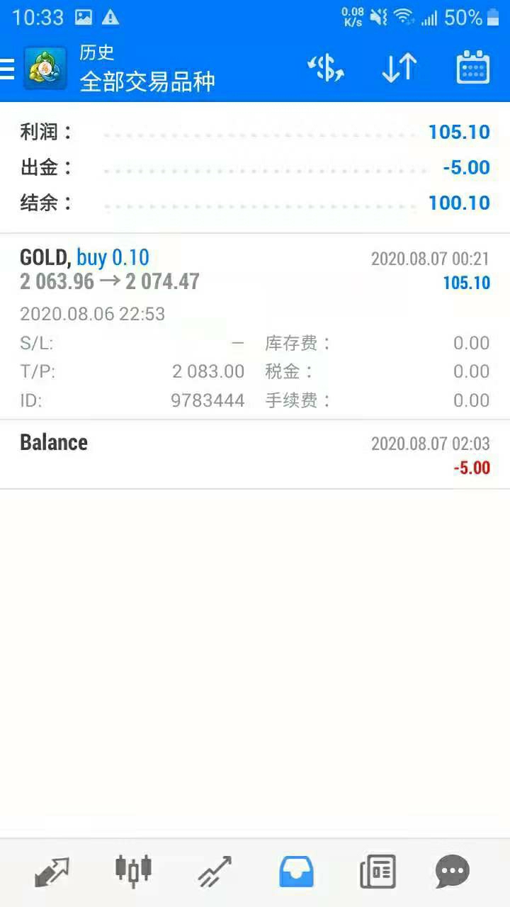 我收藏了我做黄金的一个交割单,记录了我逃黄金大顶 的操作。2020年8月7(北京时间)早6:21,黄金(gold)冲高2074.85$时,我以2074.47$(比最高点仅低0.38$)的价格平掉了我8月6晚以2063.96$买0.1手的多单,做差价10.51$,扣5$手续费后赚100.1$,花100$净赚100.1$。