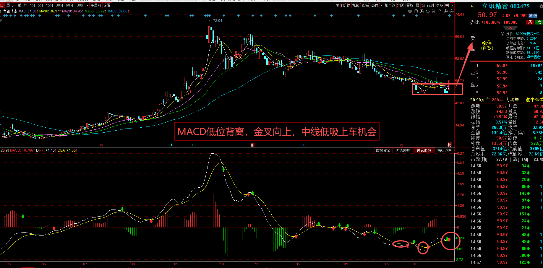 立讯精密:M A C D 低位背离,金叉向上,是中线低吸上车的好时机。昨天高开高走强势涨停,全天封单稳定,放量突破48-50元筹码区,资金大举流入,承接力拉满,无明显抛压。资金认可果链+AI+汽车三重逻辑,筹码集中后分歧收窄,主动性做多信号明确。技术上一阳穿多线,量能有效放大。今天如果高开不追,回踩50.5元附近低吸,注意控仓,目标看52元之上,短期看反弹延续,中期看估值修复。