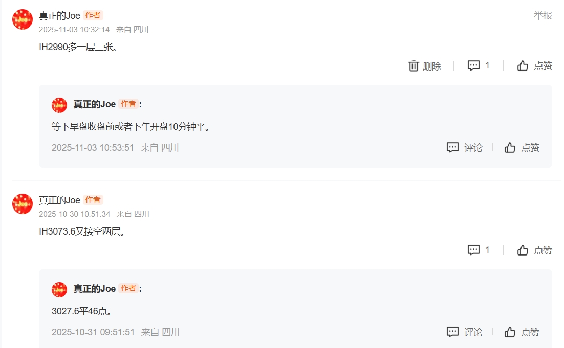 11月3日实盘贴:上周二早盘讲过上证只是过一下4000,大概率周四周五跳水回来。随之早盘收盘前挂单3076.2开两层空,周三3052.6平。周四3073.6再接两层空,周五3027.6平。今天周一早盘2990一层多,随时操作。专注IH,不做IF,IM。