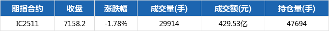 中证500期指当月合约IC2511报收7158.2点,下跌129.4,跌幅1.78%。成交量29914手,成交额429.53亿元,持仓47694手,较上一交易日减少689。