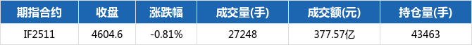 期指主力合约11月4日全跌。其中,沪深300期指当月合约IF2511报收4604.6点,下跌37.8,跌幅0.81%。成交量27248手,成交额377.57亿元,持仓43463手,较上一交易日增加1009。