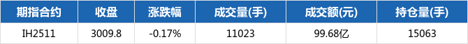 上证50期指当月合约IH2511报收3009.8点,下跌5,跌幅0.17%。成交量11023手,成交额99.68亿元,持仓15063手,较上一交易日减少1006。
